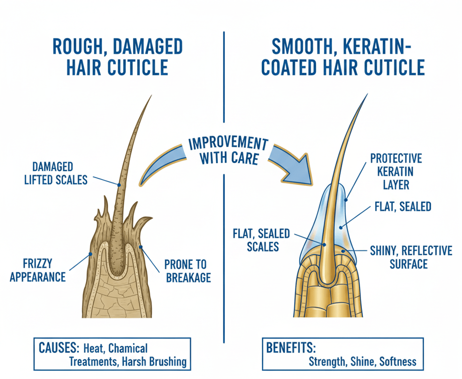 Here’s what actually happens: Fine hair is basically thin strands with a rough, raised surface. That roughness catches light unevenly and looks dull and limp. Keratin smooths that surface, making the same thin hair suddenly look shiny, healthy, and thicker.