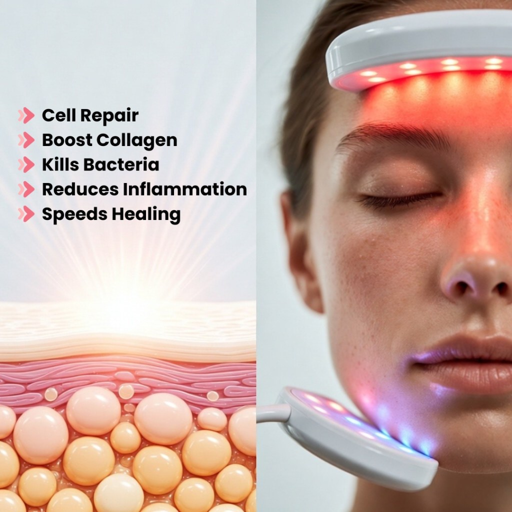 LED devices emit low-level light energy at specific wavelengths. When skin cells absorb this energy, it stimulates activity in the cell’s mitochondria, boosting ATP production, which accelerates natural repair, collagen synthesis, and inflammation control.