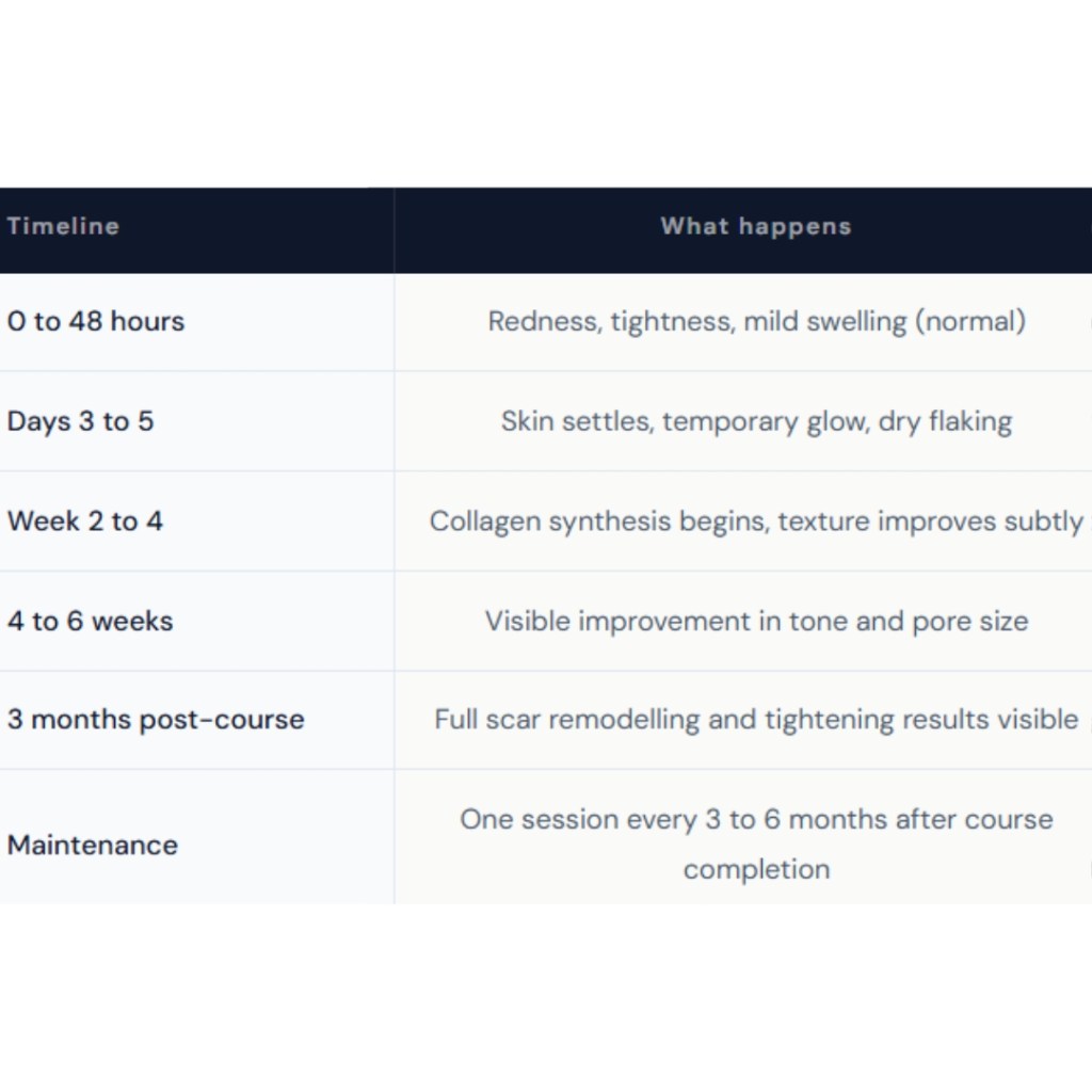 The real work happens underneath: fibroblast activation, collagen synthesis, and tissue remodelling occur over six to eight weeks following each session.