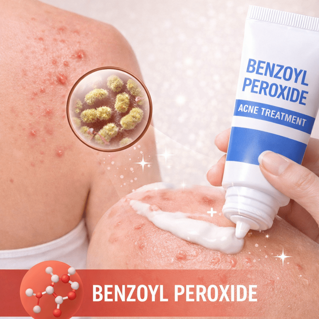 Benzoyl peroxide works by killing acne-causing bacteria and reducing inflammation. It is especially effective for red, inflamed body acne.