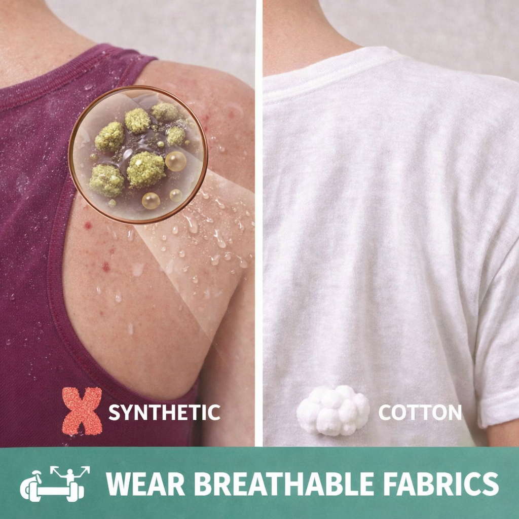 Tight and synthetic clothing traps sweat and creates friction, which worsens acne. Switching to loose, breathable fabrics like cotton helps reduce irritation.