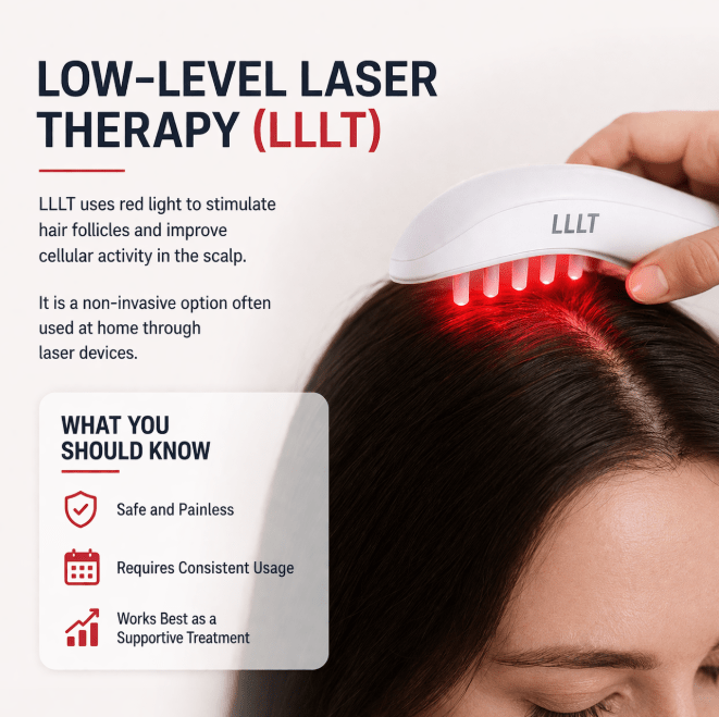 LLLT uses red light to stimulate hair follicles and improve cellular activity in the scalp.